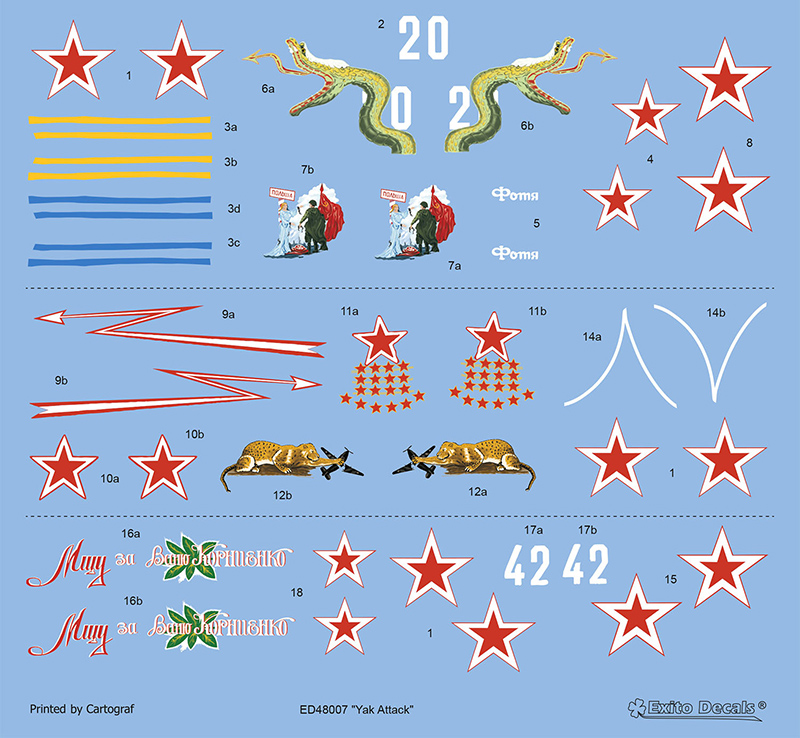 Exito Decals - 1/48 Yak Attack and includes markings for three striking Yak-1b fighters: