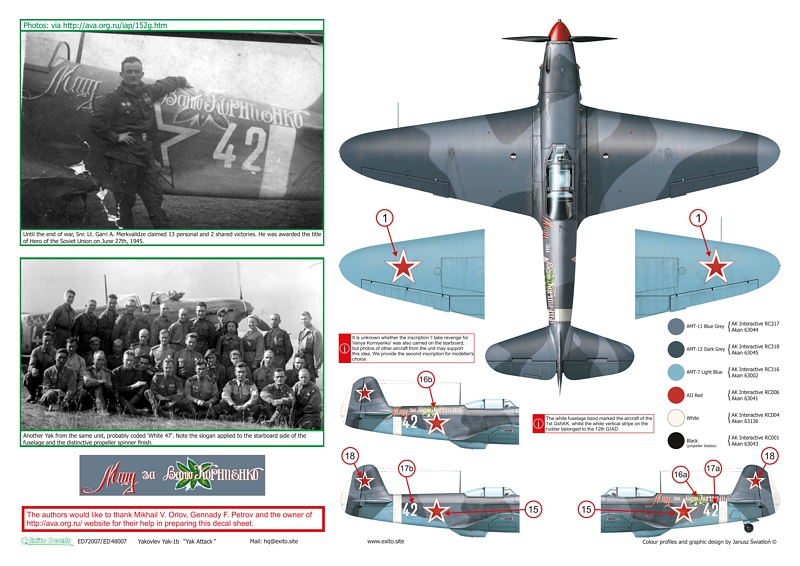 - Yakovlev Yak-1b, coded White 42 , flown by Snr. Lt. Garri A. Merkviladze of 152nd Giap / 12th GIAD, 1st Ukrainian Front, Germany, spring 1945.
