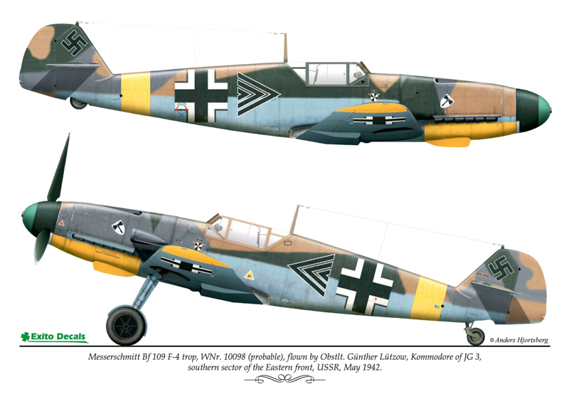 - Messerschmitt Bf-109F-4 trop, WNr. 10098 (probable), flown by Obstlt. Gunther Lutzow, Kommodore of Jg 3, southern sector of the Eastern front, USSR, May 1942.