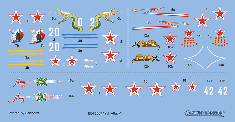 Exito Decals - 1/72 Yak Attack and includes markings for three striking Yak-1b fighters: