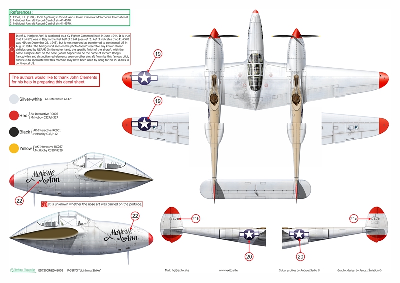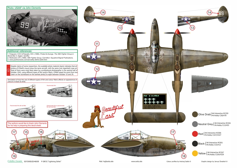 The two P-38Gs feature sexy nose art, whilst the P-38F sports a rather unusual finish. Babe and Marjorie Ann have never been reproduced in decal form before, whilst our depiction of Beautiful Lass is a result of a careful study of the available photo material and differs from all previous interpretations. Decals include bonus markings carried by Babe during its later service with the 82nd FG. Illustrations were created by Andrzej Sadlo.