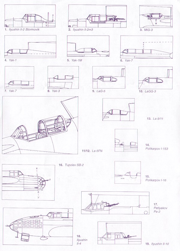 Ilyushin IL-2 Stormovik (for Mikro kits)Ilyushin Il-2M3 (for Mikro kits) Mikoyan MiG-3 (for Red Star kits) Yakovlev Yak-1 (for Mikro kits) Yakovlev Yak-1M (for Mikro kits) Yak-7 (for Mikro kits) Yakovlev Yak-1/7 (alternative windscreen) (for Mikro kits) Yakovlev Yak-3 (for Hasegawa kits) Lavochkin LaGG-5 CI Lavochkin LaGG-3 (for Emhar, FROG and Red Star kits) Lavochkin La-5FN (open) (for Italeri kits) Lavochkin La-5FN (closed) (for Italeri kits) Lavochkin La-9/11 MPM Polikarpov I-153 (for Heller and Smer kits) Polikarpov I-16 (for Hasegawa kits) Tupolev SB-2 (for FROG and Novo etc kits) Petlyakov Pe-2 (for Italeri kits) Ilyushin Il-4 AVE Ilyushin Il-10 (for Eduard kits and KP/Kopro and SMER kits)