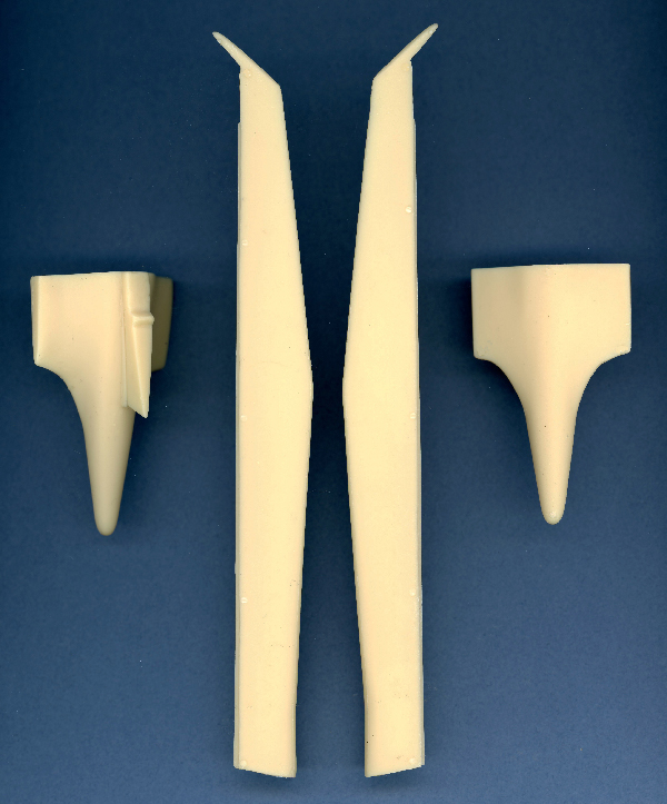 Two large wing leading edges are supplied, with integral wing-tip sections and cast pitot tubes. A resin-moulded tail section is included for the original B.1 tail cone that includes an integrally-cast lower rudder section.In addition the set provides new cast undercarriage legs for the longer nose and shorter main legs on the Mk.1 Vulcans. An etched sheet of vortex generators is also provided with brass drilling templates for these items. for Airfix kits