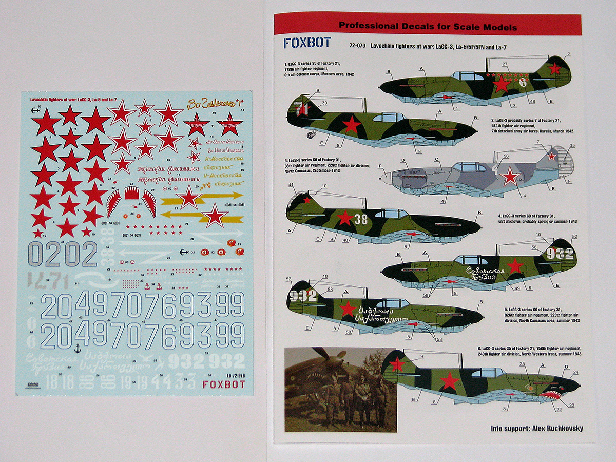 Foxbot Decals - 1/72 Lavochkin fighters at war: LaGG-3, La-5, La-5F, La-5FN and La-7. For AML, Bilek, Dakoplast, Eastern Express, ClearProp, TOKO, MisterCraft, NOVO, KP, Eduard, Roden