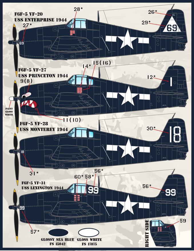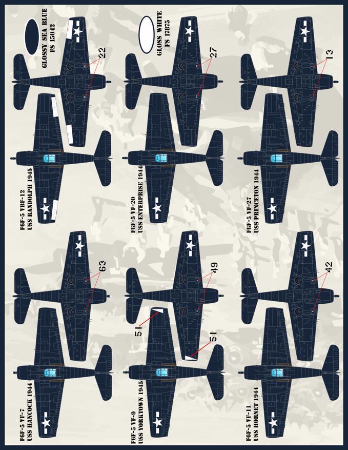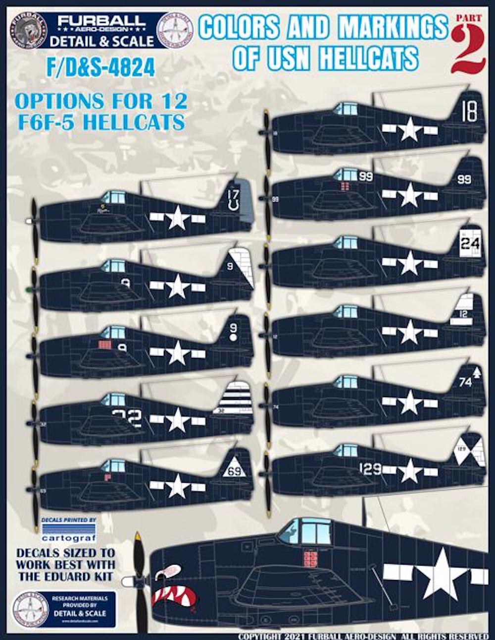 Furball Aero-Design - 1/48 Grumman Hellcat. sized for the Eduard kits. 'Colors and Markings of US Navy F6F Hellcats Part 2'. This set options for 12 F6F-5 Hellcats in the Glossy Sea Blue scheme:
