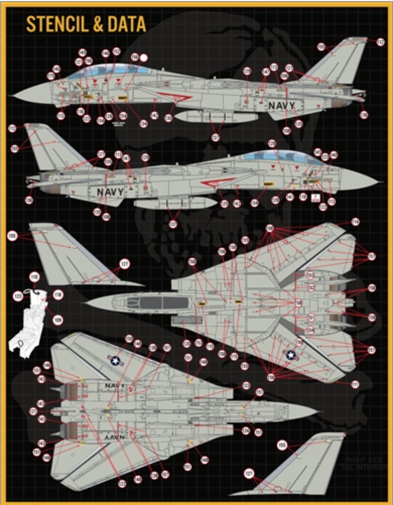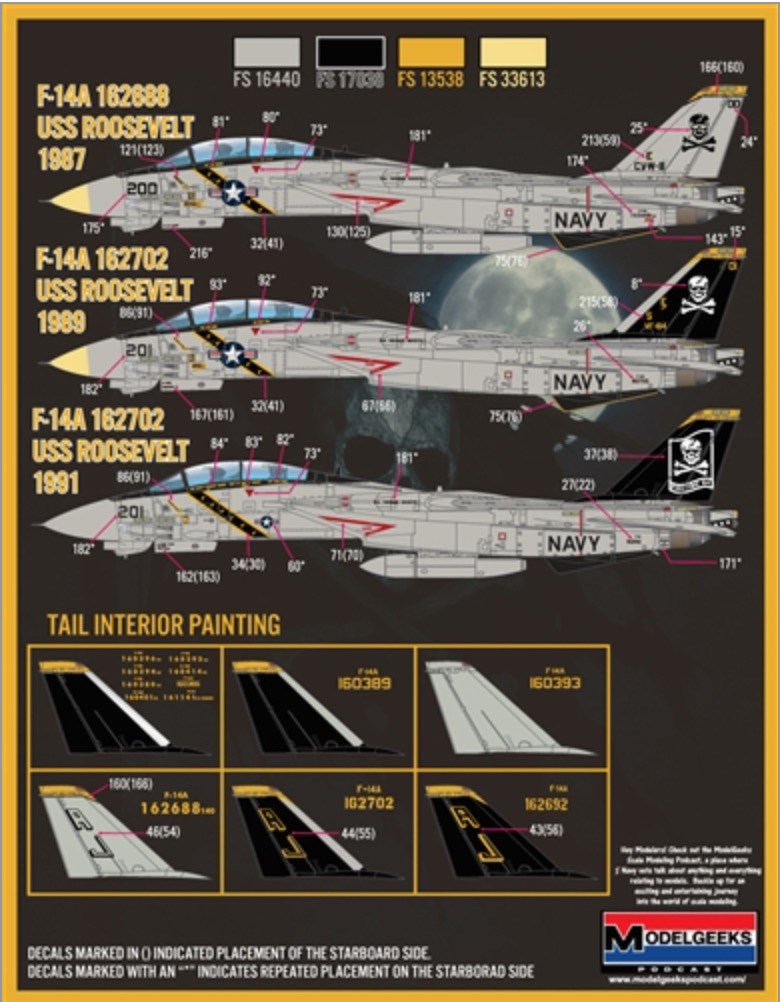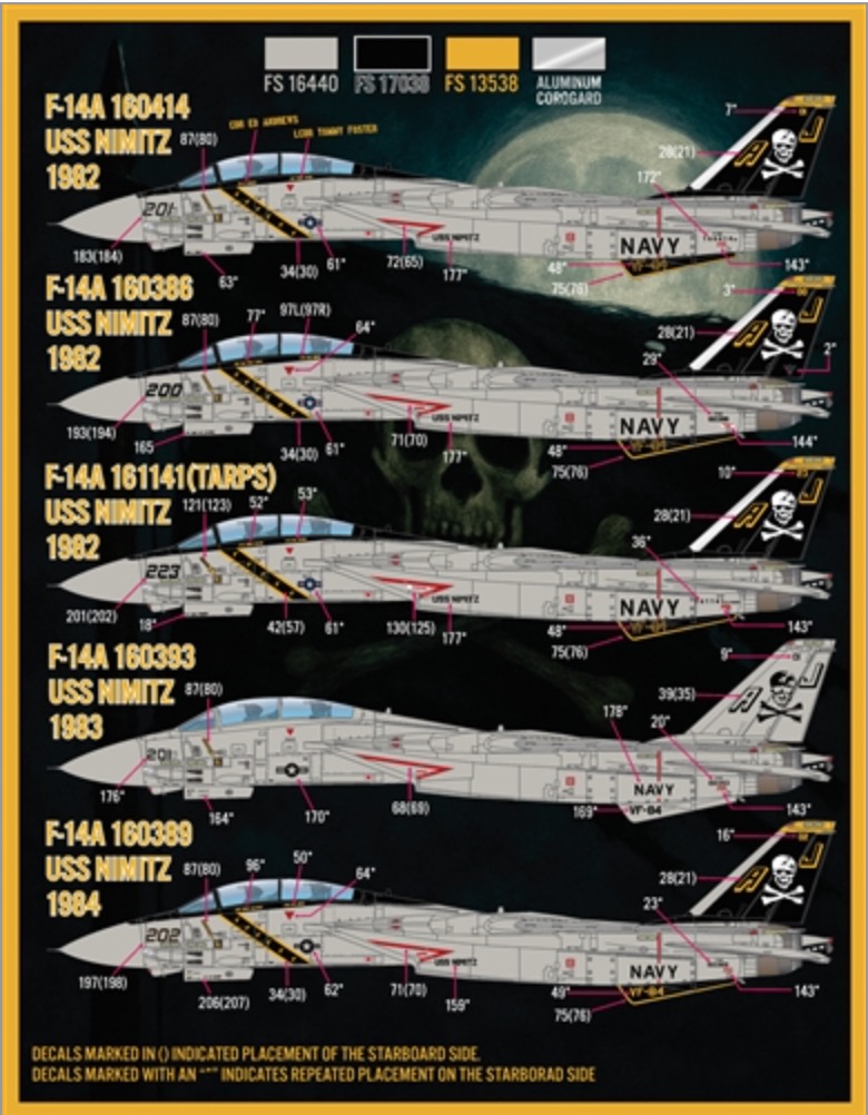 Furball Aero-Design - 1/48 'Colors & Markings of US Navy Tomcats Part 14' F/D&S-4833 covers 13 VF-84 options for the mighty Tamiya F-14A:-F-14A 160396, AJ-136, Uss NIMITZ, 1977-F-14A 160394, AJ-212, Uss NIMITZ, 1978-F-14A 160380, AJ-201, Uss NIMITZ, 1978-F-14A 160401, AJ-211, Uss NIMITZ, 1979-F-14A 160393, AJ-203, Uss NIMITZ, 1979-F-14A 160414, AJ-201, Uss NIMITZ, 1982-F-14A 160386, AJ-200, Uss NIMITZ, 1982-F-14A 161141TARPS, AJ-223, Uss NIMITZ, 1982-F-14A 160393, AJ-201, Uss NIMITZ, 1983-F-14A 160389, AJ-202, Uss NIMITZ, 1984-F-14A 162688, AJ-200, Uss ROOSEVELT, 1987-F-14A 162702, AJ-201, Uss ROOSEVELT, 1989-F-14A 162702, AJ-201, Uss ROOSEVELT, 1991Again, Enough stencil and data are included to build two complete models