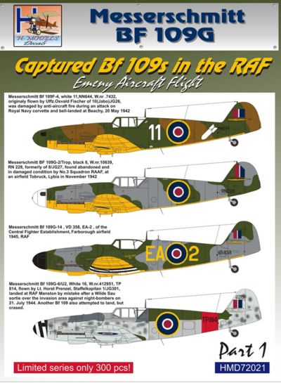 H-Model Decals - 1/72 Captured Messerschmitt Bf 109s in RAF, Pt.1 [Bf 109F-4 Bf 109G-2/Tropical Bf 109G-14 Bf 109G-6/U2