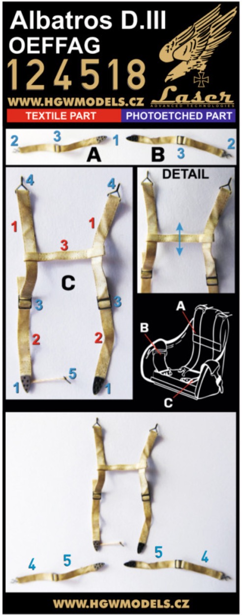 HGW - 1/24 Albatros D.III Oeffag Seatbelts Belts are made from real microfibre and in combination with included photo etched buckles they look highly realistic. This product is available in 1/24 scale and is designed for Lukgraph kit.