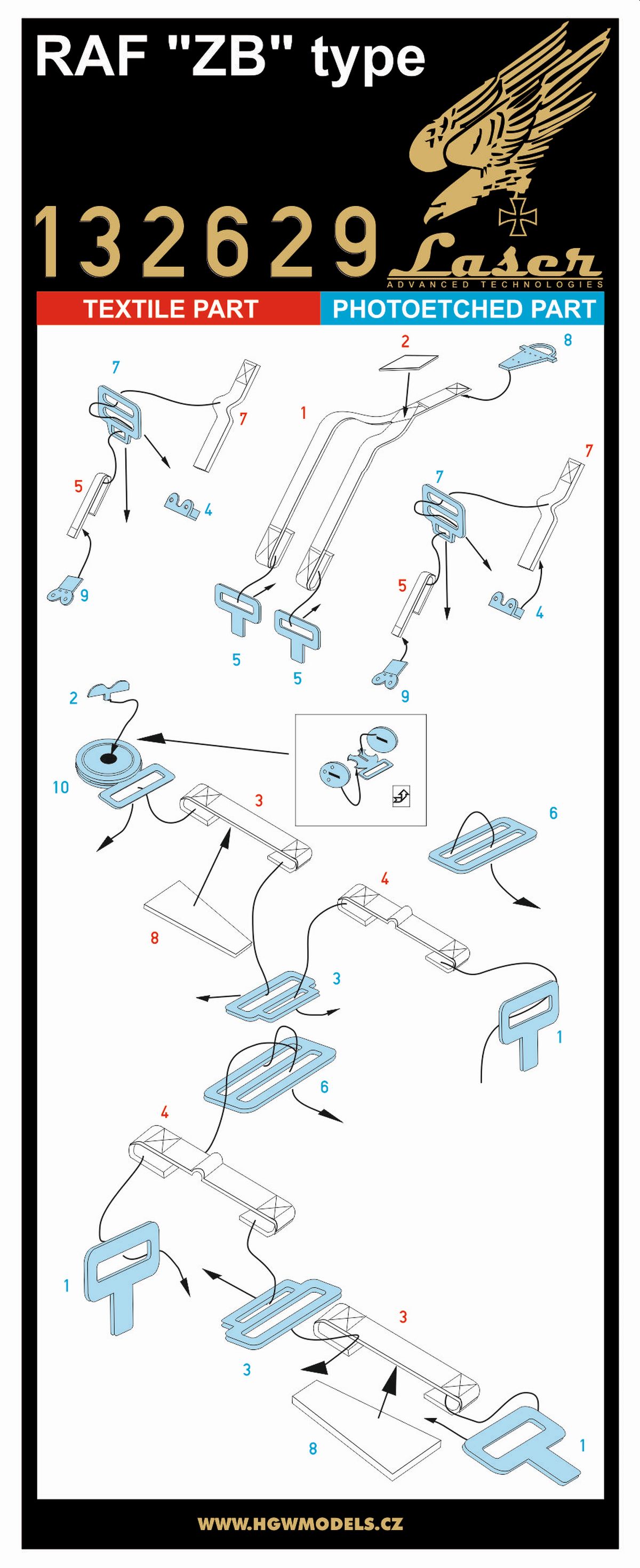 HGW - 1/32 Sutton Harness 'ZB' Type pre-cut (laser) Seatbelts. The blue harness will be the 'Z type' which was fitted, from the early 1950s, to just about everything from the Chipmunk to the Hunter and is still in production today. The harness was made up of a number of components lap straps, shoulder straps, Qrb (quick release box) and different suffix letters (from A to L) were assigned depending on the particular make up required. For example the Zf harness used in the Hawker Hunter had a Qrb with cable release for connection to the the Btru on the ejection seat and separate shoulder harnesses which individually mated with points on the parachute container of the bang seat. Other shoulder strap variations included those which which were connected to a common plate or D-ring, such as used in the de Havilland Chipmunk, and others, such as that used on the BAC/EE Canberra, had an additional horizontal webbing strap connecting the two shoulder straps into a H configuration. (for Airfix kits)