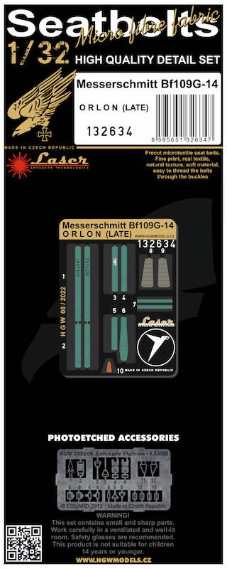 HGW - 1/32 Messerschmitt Bf-109G-14 Orlon pre-cut (laser) Seatbelts (for Hasegawa kits)