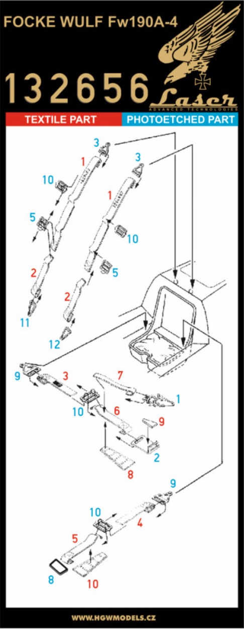 HGW - 1/32 Focke-Wulf Fw-190A-4 Seatbelts Textile seat belts in white colour designed for aircraft Focke Wulf Fw190A-4 by Zoukei Mura. Belts are made from real microfibre and in combination with included photo etched buckles they look highly realistic. (for Zoukei-Mura kits)