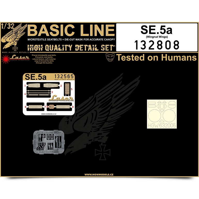 HGW - 1/32 SE.5a BASIC LINE: seatbelts + paint masks (designed to be used with Wingnut Wings kits) contains micro-fabric and photo-etched highly detailed parts designed for great SE.5a by Wingnut Wings belts are fully functional - modeler can leave them un/fastened made from printed micro-fabric material which behaves like a piece of rag textile parts are prepared for using filters and other agents (they are waterproof and resistant to common nonaggresive modeling preparations photo-etched parts are developed in cooperation with Eduard company