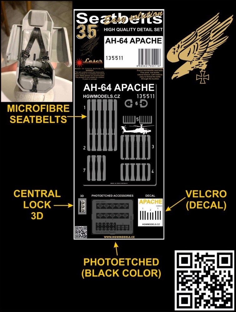HGW - 1/35 Bell/Boeing AH-64 Apache. The set contains microfibre seatbelts, dark Pe parts, 3D-printed details and decals.