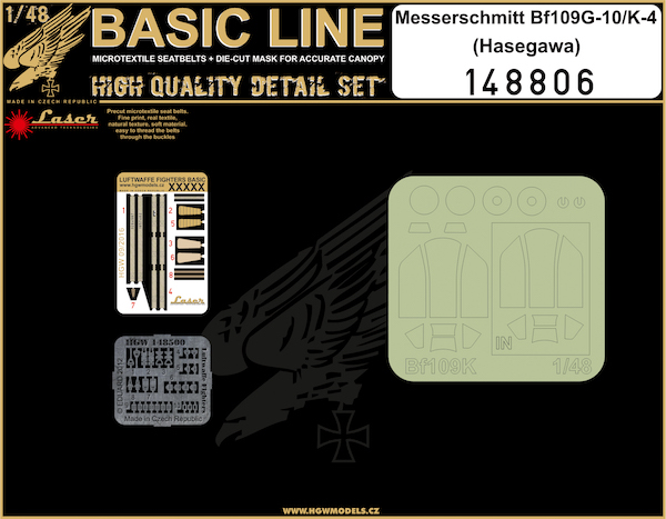 HGW - 1/48 Messerschmitt Bf 109G-10/K-4 BASIC LINE: microplastic seatbelts, etched buckles + canopy paint masks (for Hasegawa kits)