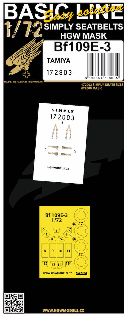 HGW - 1/72 Messerschmitt Bf-109E-3 Basic LINE: seatbelts + masks (for Tamiya kits)