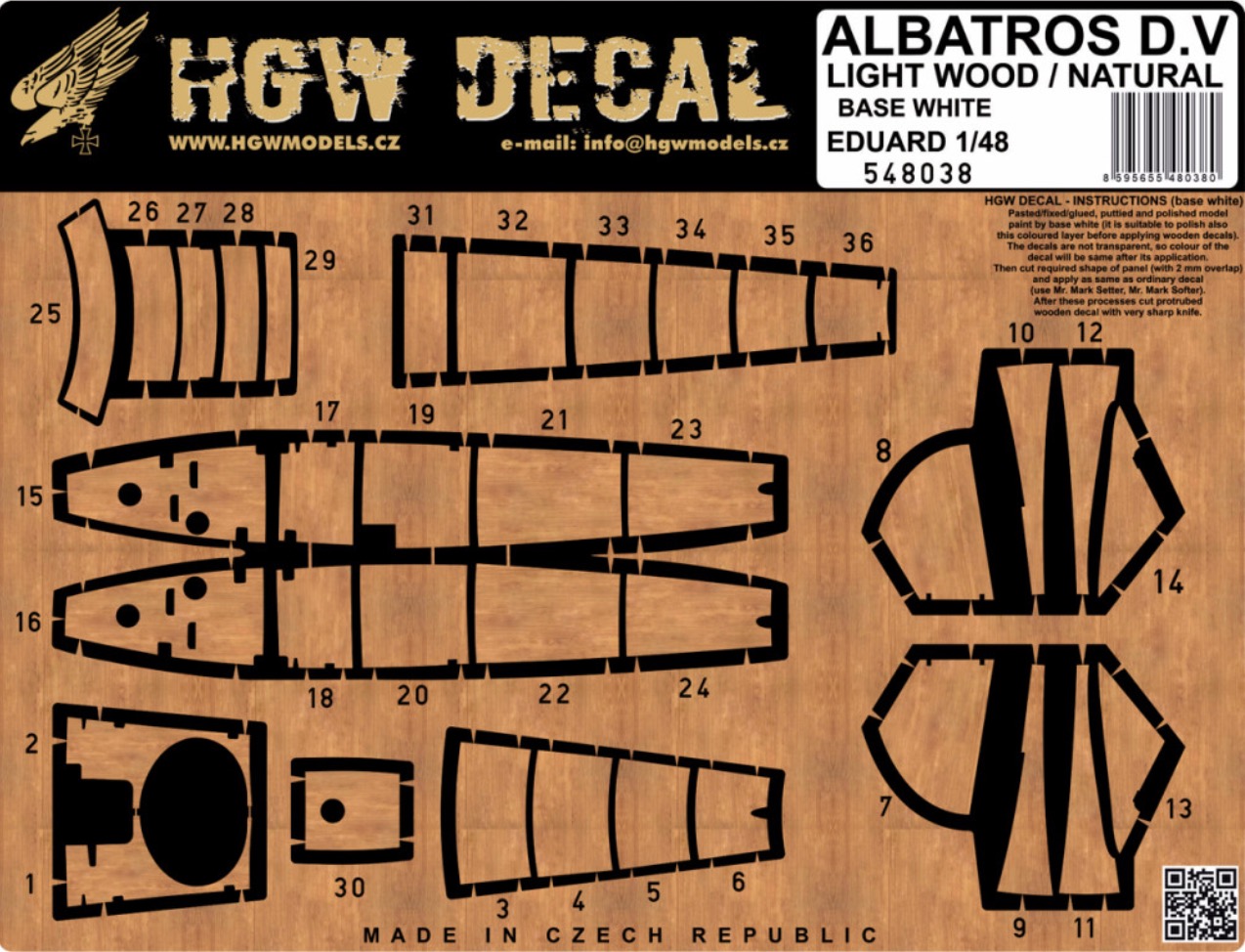 HGW - 1/48 Albatros D.V & D.VA LASER-CUT DECAL. Decal set designed for model Albatros D.V & D.Va in 1/48 scale from Eduard. This is light wood natural imitation. Decal is base white so it is not necessary to apply it to painted surface.