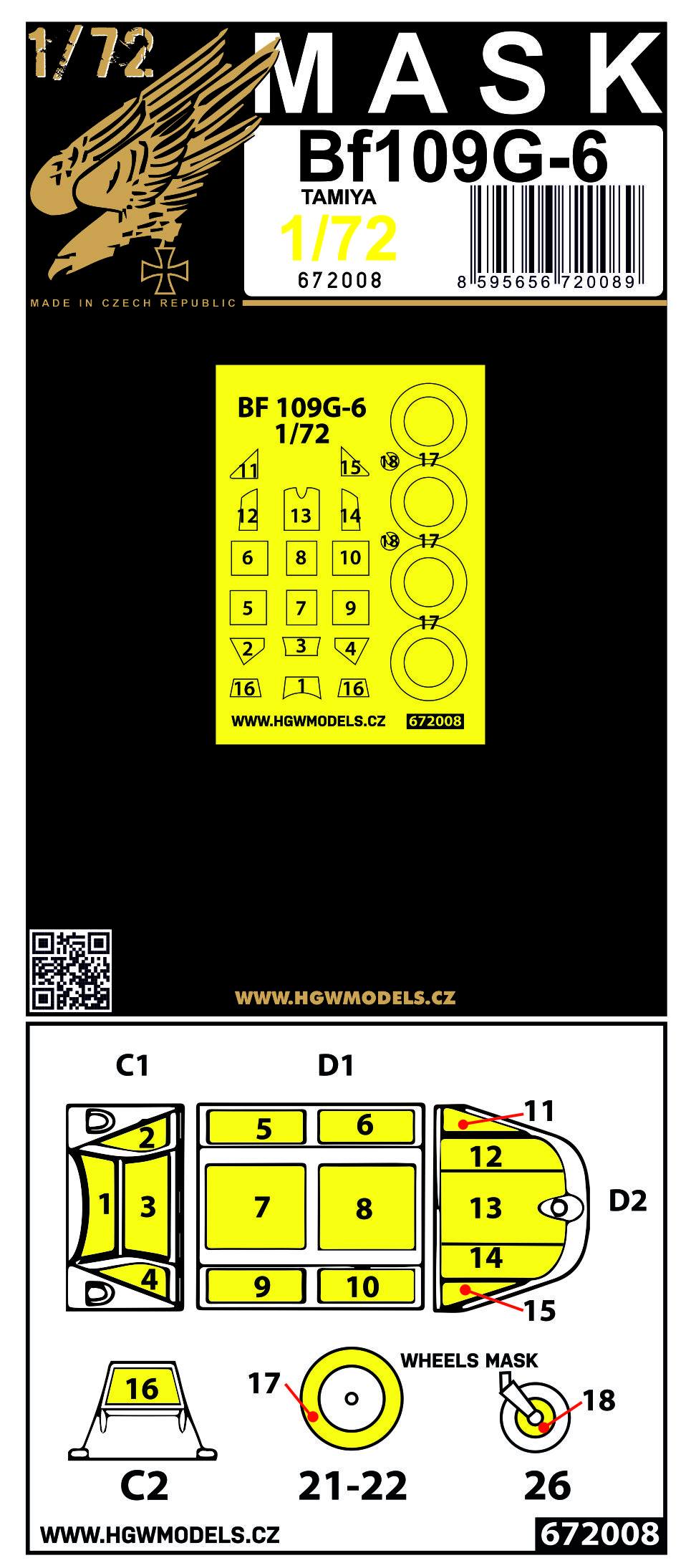 HGW - 1/72 Messerschmitt Bf-109G-6 wheels and canopy frame paint mask outside only (for Tamiya kits)
