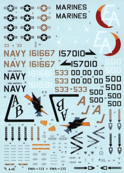 Hi Decal - 1/48 Grumman A-6E 'TRAM' Intruder (3) 161667 AJ/633 VA-36, USN, Uss Theodore Roosevelt Operation 'Desert Storm', 1991, tan and sand scheme, 157010 AB/500 VA-85, USN, Uss America Operation 'Deny Flight', 1993, 161681 EA/500 VNA(AW)-332, USMC, Mcas Cherry Point, 1993