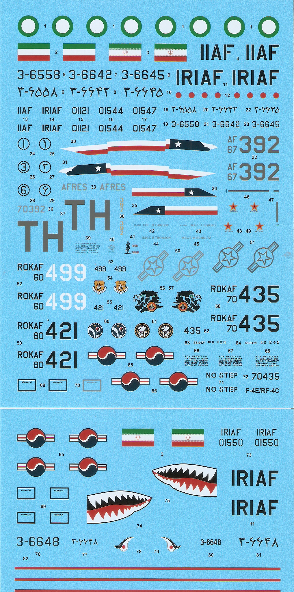 McDonnell RF-4C 67-0436 131st Trs 39th Trg South Korean Air Force grey camouflage, F-4E 67-0392 457th Tfs 301st Tfw `War Lord' double MiG killer Usafr Texas 1989 Grey camouflage, 3-6658 11th Tfs I Mehrabad 1978, 3-6645 61st Tfw Bushehr 1980, 3-6642 32nd Tfw Nojeh 1985, all Iran Air Force Dk Green,Brown/Sand camouflage, 76-0499 152nd Tfw 17th Tfw Daegu 1980 Sea camouflage, 68-0421 156th Tfs 10th Tfw Suwon 1998 Lt/Dk Ghost Grey. Both South Korean AF.