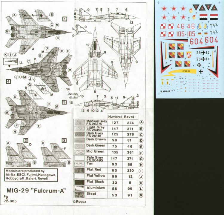 HI Decal - 1/72 Mikoyan MiG-29 (5) Soviet Air Force Red 46 1990, Iraqi Air Force 1990-91 Polish Air Force Red 105 1881, E. German Red 604 Last flight in GDR service 1990, German Air Force 29 14 1990