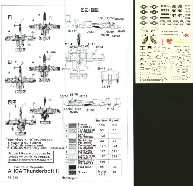 HI Decal - 1/72 Fairchild A-10A (4) 76-552 706TFS Air Force Reserve Experimental brown/sand camouflage, 76-530/BD 46TFW Air Force Reserve Experimental grey camouflage, 76- 544/NO 706TFS Air Force Reserve Desert Storm, 76-708/NY 138TFS The Boys from Syracuse