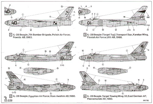 HI Decal - 1/72 Ilyushin Il-28 Beagle (4) Red 40 7th Bomber Brigade Polish Air Force 1963, Egyptian Air Force Kom Awshim AB 1980, Black 01 Target Tug Finnish Air Force 1968, Red 208 Target Towing Wing 33, East German Air Force Peenemunde 1980