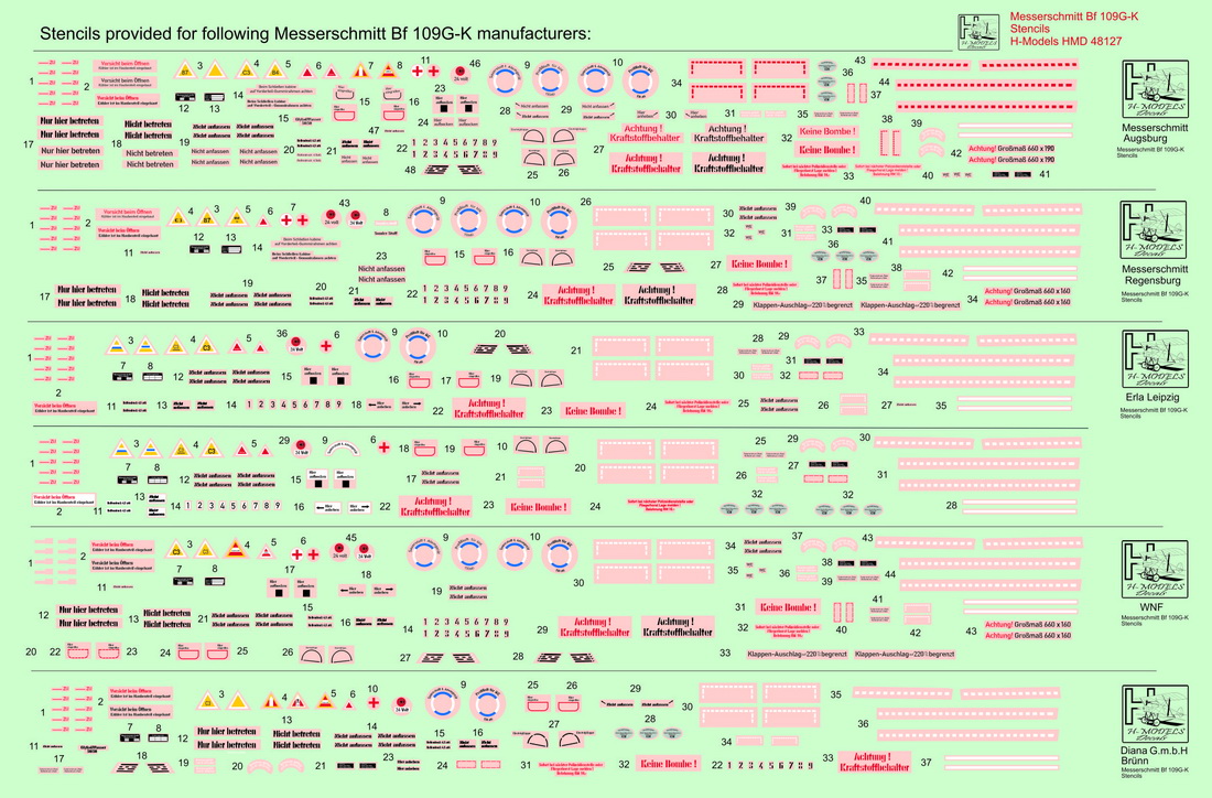 H-Model Decals - 1/48 Messerschmitt Bf-109G/K Stencils (sets for 5 different aircraft manufacturers)[Bf-109K]