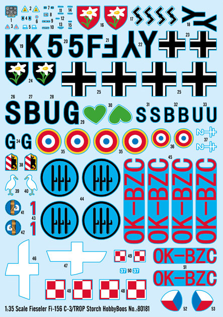 Hobby Boss - 1/35 Fieseler Fi-156A C-3/Trop 'Storch' In 1936, Rlm issued requirements for liaison and artillery fire spotting aircraft for the Wehrmacht and Luftwaffe. This aircraft must have a Short Takeoff and Landing (STOL) performance. The Fi-156 entered small scale series production in 1937. When she is in flight, the landing gear hung down. This is giving aircraft the appearance of a very long-legged with big-winged bird. The Fi156 was given a nickname--Storch (Crane).
