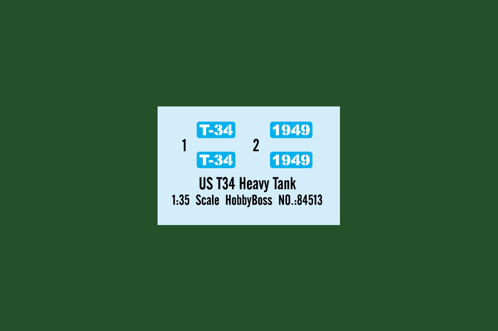 Hobby Boss - 1/35 US T34 Heavy Tank. The T34 Heavy Tank was an American design for a heavy tank. It was evolved from the T29 Heavy Tank and T30 Heavy Tank in 1945, sporting a 120 mm 4.72 in modified anti-aircraft gun. Extra armour plating was applied to the rear of the turret bustle as a counterweight for the heavier 120mm T53 main gun. The vehicle was deemed too heavy and no production orders were placed