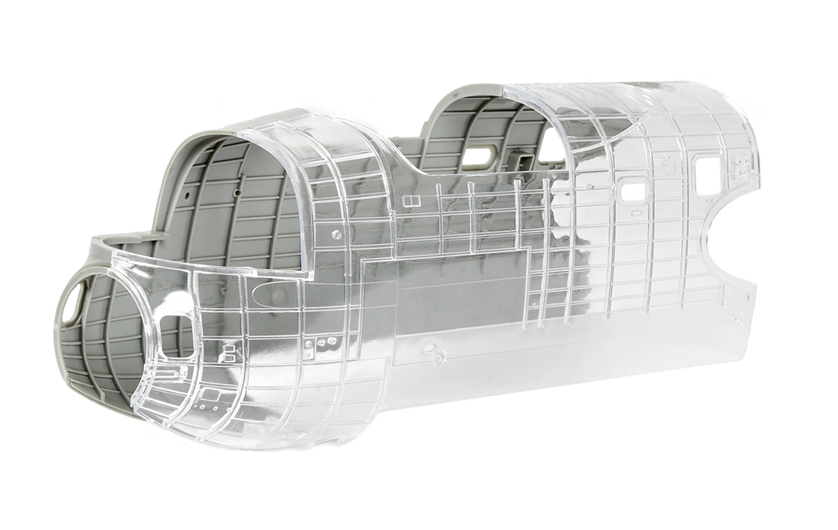 In production the fuselage and nose section will be injected without surface detail in crystal clear plastic first. The moulds will then be modified and surface detail added, an irreversible change meaning the clear version can never be produced again! Length 663mm,