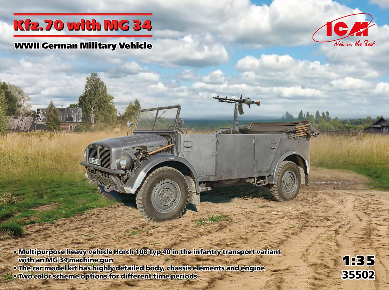 ICM - 1/35 July RELEASE!!! Kfz.70 with Mg 34, WWII German Military Vehicle The infantry transporter Kfz.70 was one variant of the army vehicle Horch 108 Typ 40. This heavy off- road vehicle was produced by Horch and the German branch of Ford until 1942. Serving as a multifunctional military transport for the Wehrmacht, the vehicle performed a wide range of tasks across various theaters of combat, from France to Stalingrad and from North Africa to Scandinavia. Some of these vehicles could be equipped with different types of armaments, including anti-aircraft guns, Zwillingssockel 36 twin-mount anti-aircraft machine gun installations, or Mg 34 machine guns. Vehicles equipped in such a manner were used for anti-aircraft defense, providing fire support,