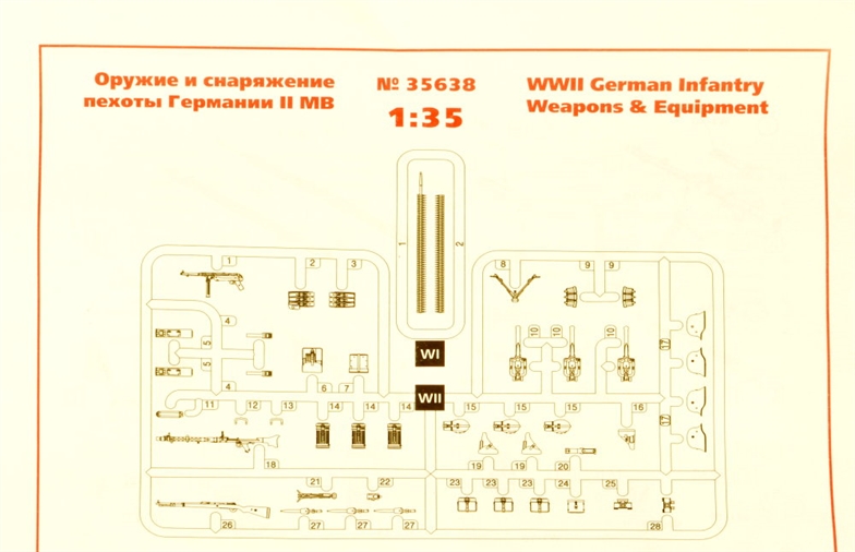 ICM - 1/35 WWII German Infantry Weapons & Equipment (100 new moulds). The set includes plastic kits of WWII German infantry weapons and equipment MG34 machine guns, ammunition boxes and tapes for the Mg 34, Mauser M98k rifles, MP40 submachine guns, ammunition pouches, Luger P08 and Walther P38 pistols in holsters, knife bayonets in scabbards, M36 steel helmets, respirator cases, binoculars and cases, officer bags, flashlights, small shovels, mess-tins, canteens