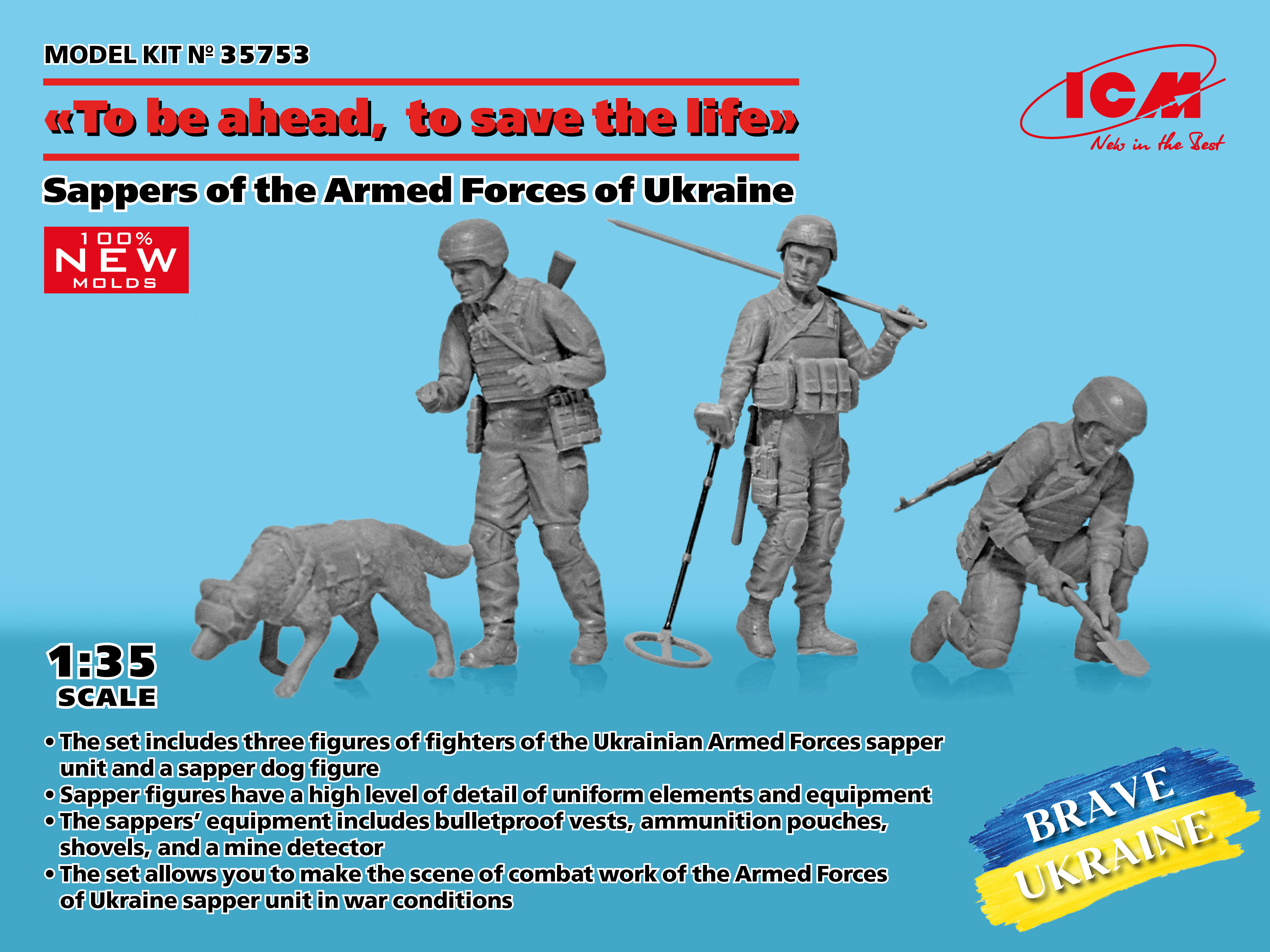 ICM - 1/35 'To be ahead, to save the life', Sappers of the Armed Forces of Ukraine (3 figures and a sapper dog in a protective mask)(100% new molds) In the Armed Forces of Ukraine, as in other armies of the world, the tasks of sapper units include conducting