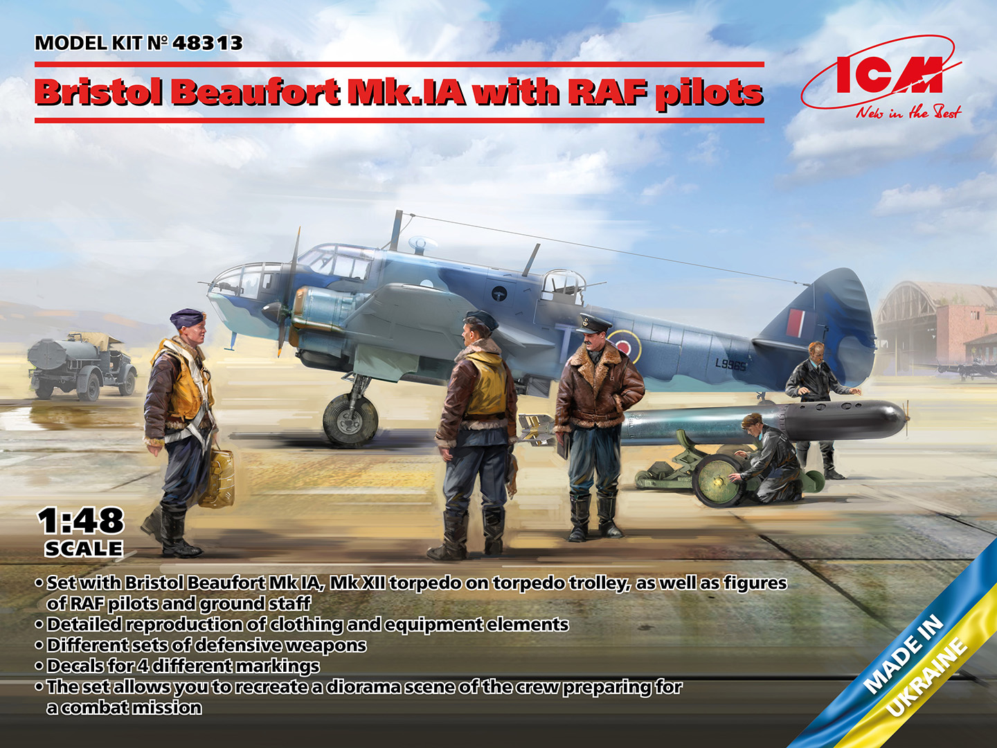 ICM - 1/48 Bristol Beaufort Mk.IA with Raf pilots. The Bristol Beaufort torpedo bomber began to arrive at the Raf Coastal Command in late 1939, and the following spring they began to see combat. The aircraft carried out aerial mining of sea harbors, conducted day and night torpedo attacks, and bombed coastal targets. In the course of its operation, the Bristol Beaufort was improved, its armament and equipment changed. The Mk.IA modification received a new machine-gun turret, and Asv radars were installed on the torpedo battleship to search for ships. One of the areas of combat service of this aircraft was the Mediterranean Sea, where the targets were transport convoys and warships of the Axis countries. It should be noted that service on torpedo battleships was extremely difficult and dangerous, and in some periods of the war, losses among their crews were the highest in the entire Royal Air Force. However, despite all the difficulties, torpedo bomber pilots were able to carry out a significant number of successful attacks on enemy ships.