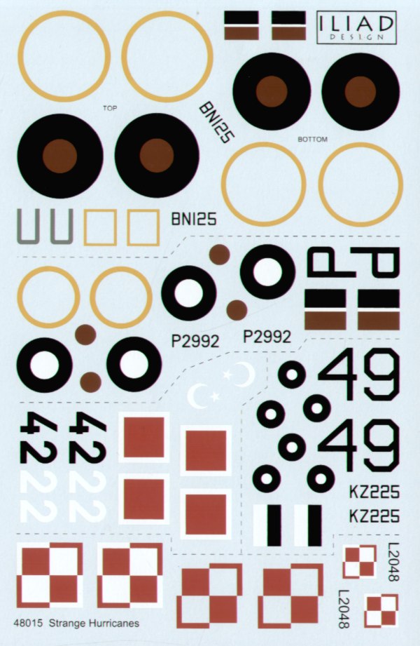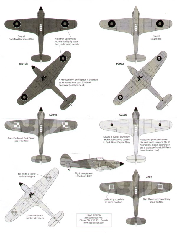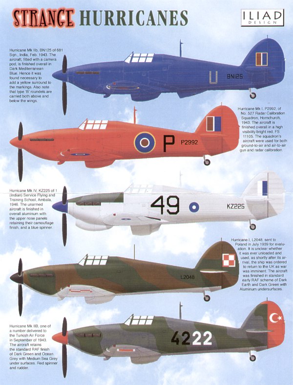 Iliad Design - 1/48 Strange Hawker Hurricanes (5) Hawker Hurricane Mk.I P2992/P 527 Radar Calibration Sqn, Hornchurch 1943 overall red, L2048 as evaluated in Poland 1939, Hawker Hurricane Mk.IIb BN125 681 Sqn India 1943 overall blue, 42/22 in Turkish markings 1943, Hawker Hurricane Mk.IV KZ225/49 1(Indian) Service Flying and Training School 1946 overall aluminium
