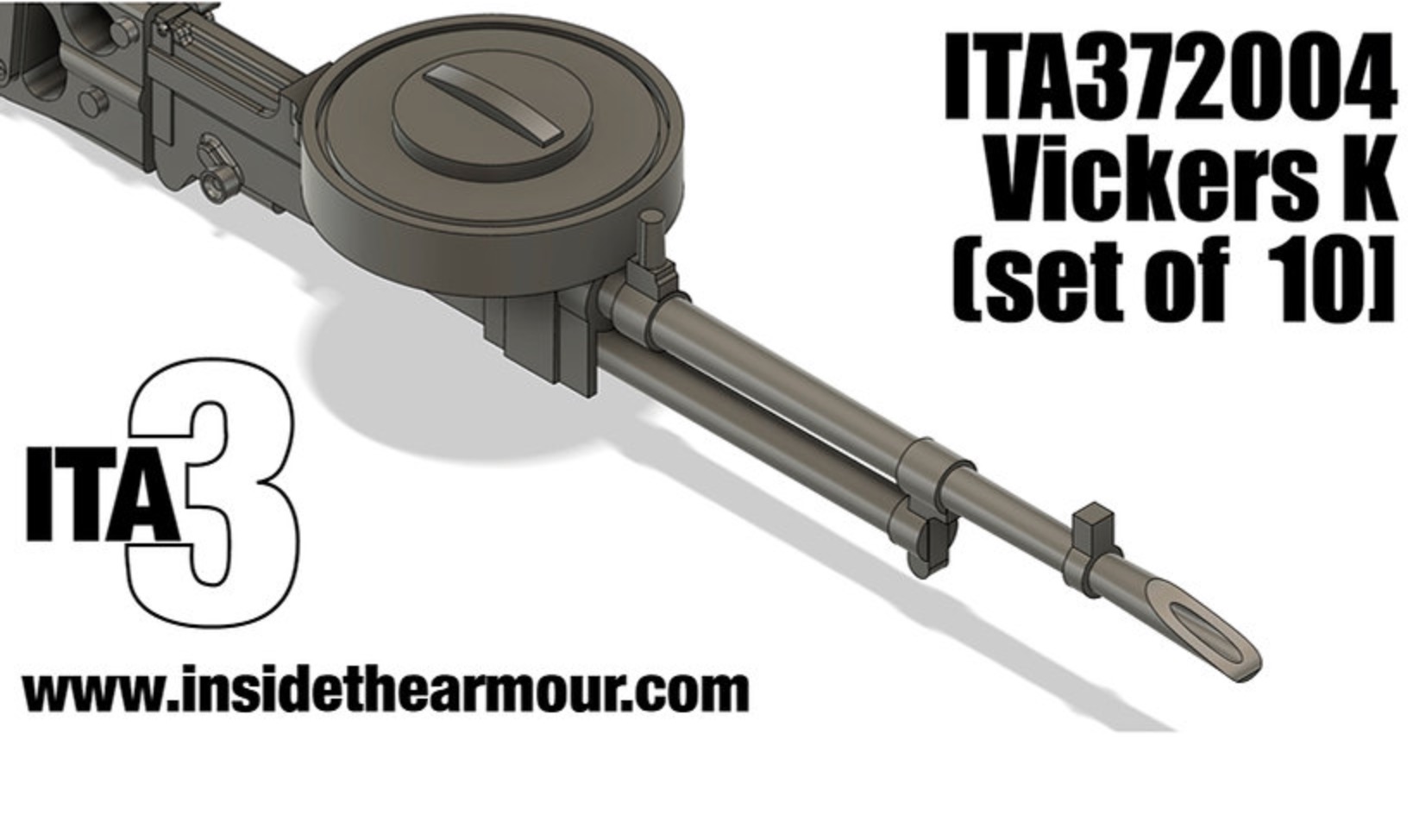 Inside the Armour - Vickers K 10 set 3d-printed a set of ten 1/72 vickers K guns commonly used on British aircraft. Hugely improved detail over kit items, easy to remove from the supports, and supplied in a pretectived printed box. As used on Raf Fairey Battle and Handle-Page Hampden. In gun turrets, such as the dorsal turret in the Bristol Blenheim, the nose turret in the Armstrong Whitworth Whitley and the rear of the cockpit in the Fairey Battle. It was the standard Royal Navy Fleet Air Arm 'Telegraphist Air Gunner' machine gun, on British built carrier Torpedo Strike Reconnaissance aircraft the Fairey Swordfish, the Fairey Albacore and the Fairey Barracuda. As supplies of air-cooled .303 in 7.7 mm Browning machine guns increased the Vickers G.O. was phased out of use with the RAF. These machine guns were then reallocated from Raf stocks to units of the British and Commonwealth armies. The gun continued in service with the Fleet Air Arm and its last recorded use by the navy was by 812 Squadron Rnas Barracudas in anti piracy patrols off Hong Kong in October 1945.
