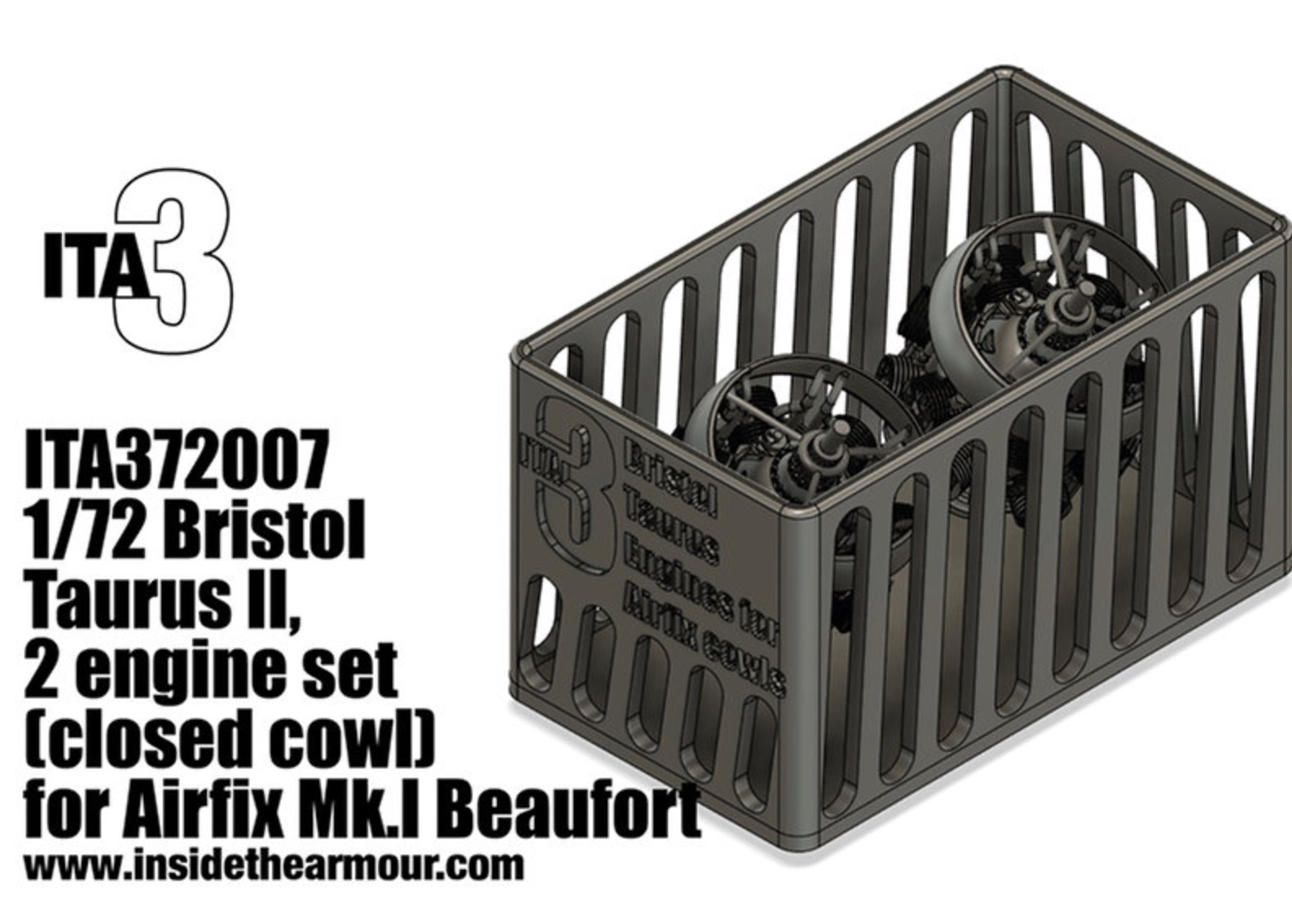 Inside the Armour - 1/72 Taurus II Engines set of 2 closed cowl version for Airfix a set of two 1/72 handed Bristol Taurus II engines for the Airfix Bristol Beaufort. Note this version is suitable only for closed cowls.