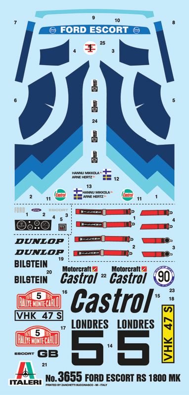 Italeri - 1/24 Ford Escort Mk.II The Ford Escort Mk 2 was launched in 1975. It was a significant evolution compared to the Escort Mk 1 that debuted at Brussels Motor Show in January 1968. It used the reliable mechanical components as the Mk 1 but adopted a new design based on a squared-style look able to be in line with the aesthetic and stylistic taste of the 70s. The product range was wide, declined in three body styles (2 doors, 4 doors and 3 doors station wagon), five type of engines and a significant variety of settings and configurations. The Escort Mk 2 was mainly produced in the Ford Group German plants and achieved a good commercial success. In addition to the more classic version, it was also released the Escort Sport version characterized by a more aggressive look and distinctive sport interiors. To compete, successfully, in World Rally Championship, a dedicated model, the RS 1800, was introduced to complete the line up. Successful results has been achieved. The team Waldegård Björn - Thorszelius Hans, that got the second place in the Wordl-famous Monte Carlo Rally in 1979, won the World Rally Championship at the end of the year. The Motosport team also achieved excellent results with the other team, ranked fifth in the Monaco 1979 sport event, formed by Mikkola Hannu and Hertz Arnee.