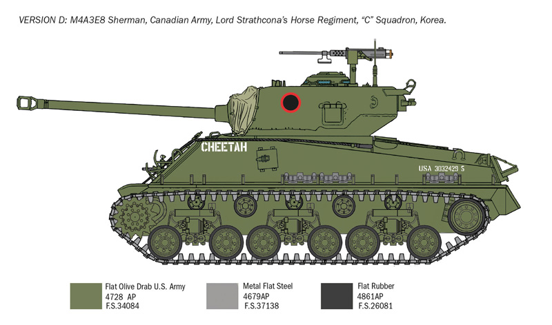 The M4 Sherman medium tank was the primary tank used by the United States during World War II. It has been produced in a significant number of units ant it formed the backbone of United States armored forces during at those time. It has been produced in several variants and versions The production of the M4A3E8 versions started at the end of 1944. The M4A3E8, adopting the nickname Easy Eight, took several technical improvements enhancing the Sherman operational effectiveness. The 76mm M1 high velocity gun had been flanked by a new horizontal volute spring suspension (HVSS) system able to ensure a improved driving condition and to guarantee a higher speed. The easy eight participated in the final stages of the Second World War and took an active part in the Korean War, alongside the M26 Pershing and M46 Patton.