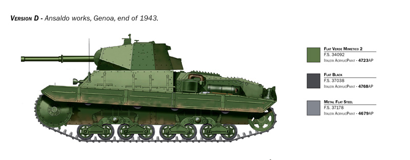 The early years of WW2 highlighted the inadequacies of Italian medium tanks in modern warfare, which was now characterized by clashes between heavily armed and heavily armored tanks, and also by the use of more effective and lethal anti-tank weapons. Following detailed analysis of German and wartime opponents British and Soviet military vehicles, a 26 ton heavy tank was created. This new tank, which underwent several design changes over time, incorporated more modern features such as inclined front plates, a more powerful and better performing 420 Hp diesel engine and a more suitable main armament, the 75/34 Ansaldo gun. The P26/40 as it would forever be known, unfortunately retained some obsolescent features that were characteristic of Italian armoured vehicle production from the mid 1930s, namely the armor plate riveting snd the leaf spring suspension system.