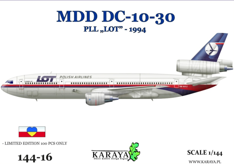 Karaya - 1/144 Mdd DC-10-32 -plastic parts made in Ukraina (AMP/Mikromir). Contains: plastic parts, painting mask, decals for 2 liveries of Pll 'LOT' (ex-Malaysia Airlines and ex-Finnair).
