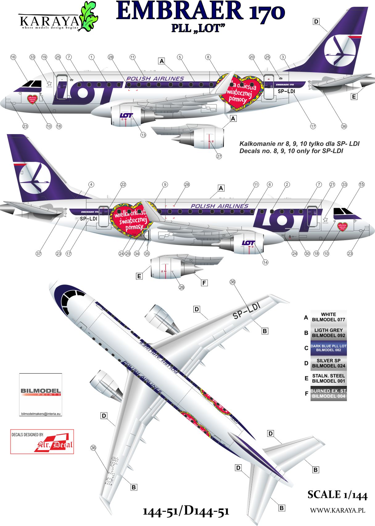 Karaya - 1/144 Embraer 170 Pll Lot early and special Wosp liveries plastic parts Hasegawa + silk/digital printed decals.