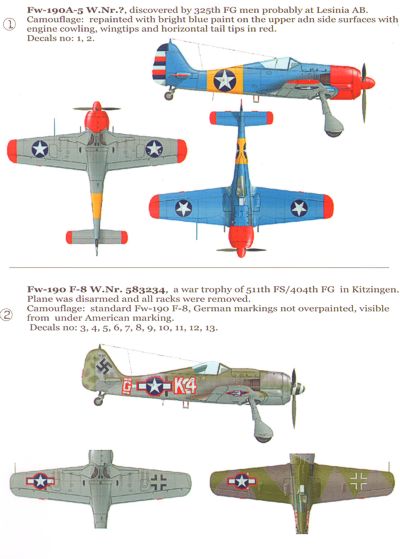 Karaya - 1/48 Scale Colourful Captured Butcherbirds Part 5 (4) Focke-Wulf Fw 190A-5 captured by 325th Gf and painted blue fuselage and top of wing, grey underwing with red nose and yellow fuselage band; Focke-Wulf Fw 190F-8 K4-G captured by 511th FS/404th Fg not overpainted; Focke-Wulf Fw 190A-8 Captured at St.TRond Ab Belgium 1/1/45 by 404th Fg flown by Col.Leo Moon, overall bright red with code OO-L; Focke-Wulf Fw 190F-8 captured by 354th Fg Jan 45 flown by Maj Jim Dalglish. Overall yellow with red nose and trim.