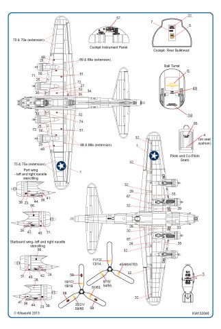 Kits-World - 1/32 Boeing B-17F Flying Fortress Comprehensive General stencilling including Cockpit instrumentation, Fuel tank hatch info, Propeller logos, Black walkway lines, Life raft & data panels - Type 1 tail and fuselage insignia - and more!