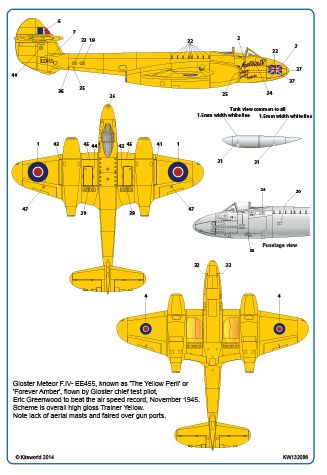 Kits-World - 1/32 Scale Gloster Meteor F.4 EE455, known as 'The Yellow Peril' or 'Forever Amber', flown by Gloster chief test pilot, Eric Greenwood to beat the air speed record, November 1945. Scheme is overall high gloss Trainer Yellow. Note lack of aerial masts and faired over gun ports.