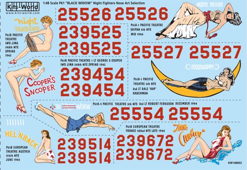 Kits-World - 1/48 Northrop P-61A/P-61B 'Black Widow' (7) 25526 'Nightie Mission' 6th NFS, 25527 'Moonhappy' 6th NFS, 239514 'Hel'n Back' 416th NFS, 239572 'Little Audrey' 422nd, 239525 'Night Take Off' 548th NFS, 239454 'Cooper's Snooper', 25554 'The Virgin Widow' 6th NFS. Individual aircraft markings only. ------(Northrop P-61A/Northrop P-61B)