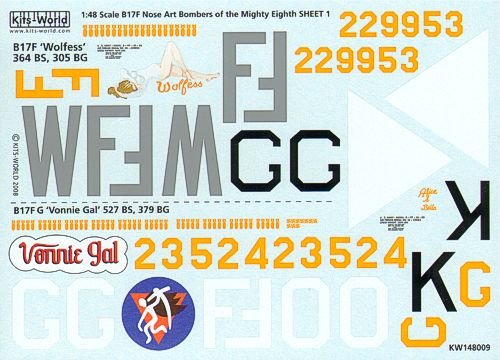 Kits-World - 1/48 Boeing B-17F Flying Fortress Mighty Eighth Air Force Nose Art Pt 1 (2) 229953 WF-F 364th BS, 305th Bg Wolfess Boeing B-17F/G 23524 FO-G 572nd BS, 579th Bg Vonnie Gal . Individual aircraft markings only