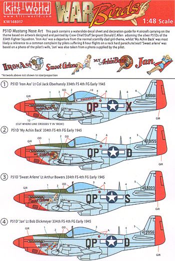Kits-World - 1/48 North-American P-51D Mustang 334th FS,4th Fg (4) 411661 QP-X Lt.Col Jack Oberhamsly Iron Ass , 473155 QP-D My Achin Back , 453223 QP-S Lt Arthur Bowers Sweet Arlene , 413056 QP-D Lt Bob Dickmeyer Jan . Individual aircraft markings only.