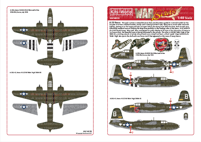 Kits-World - 1/48 Douglas A-20 Havocs. A-20G, Havoc 43-9224 F6-E - 5H-E 'Miss Laid' of the 410th BG, France, July 1944 - A-20G-45, Havoc 43-22166 'Ridin' High' 388th BS.