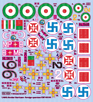 Kits-World - 1/48 Hawker Hurricane Mk.IIc/Trop, 2-32, operated by the Imperial Iranian Air Force, Doshan Teppeh AB, 1947. Aircraft has been modified as a two-seat trainer. Hawker Hurricane Mk.IIc/Trop, HL988, operated by the T?rk Hava Kuvvetleri (Turkish Air Force), Middle East, 1942. Note over painted original RAF markings. Hawker Hurricane Mk.I, HC456, flown by Capart Heikki Kalaja, 1/LeLv 30, Ilmavoimat (Finnish Air Force), Utti, July 1941. Hawker Hurricane Mk. IIc, MP+B/624, operated by the Esquadrilha MP, For?a A?rea Portuguesa (Portuguese Air Force), Sintra AB, Portugal, 1950 s.